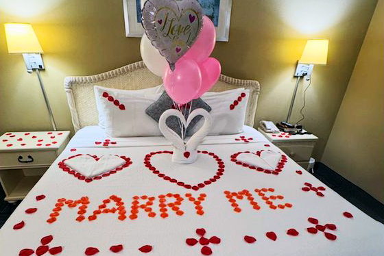 - Rose petals scattered through the entrance and hallway, with "Marry Me" spelled out on the bed
