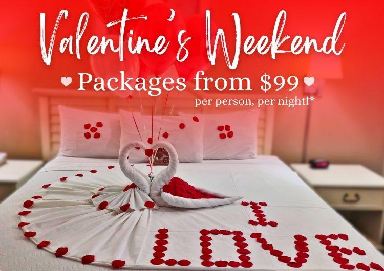 Package Details: Rates are based on a two night stay for two guests, February 13 to February 15, 2026. The package includes dinner for two and a rose petal turndown service. Starting rates are listed per person, per night, and include all taxes and fees. Additional enhancements are available at the time of booking, including breakfast, champagne and chocolates, balloons, and wine.